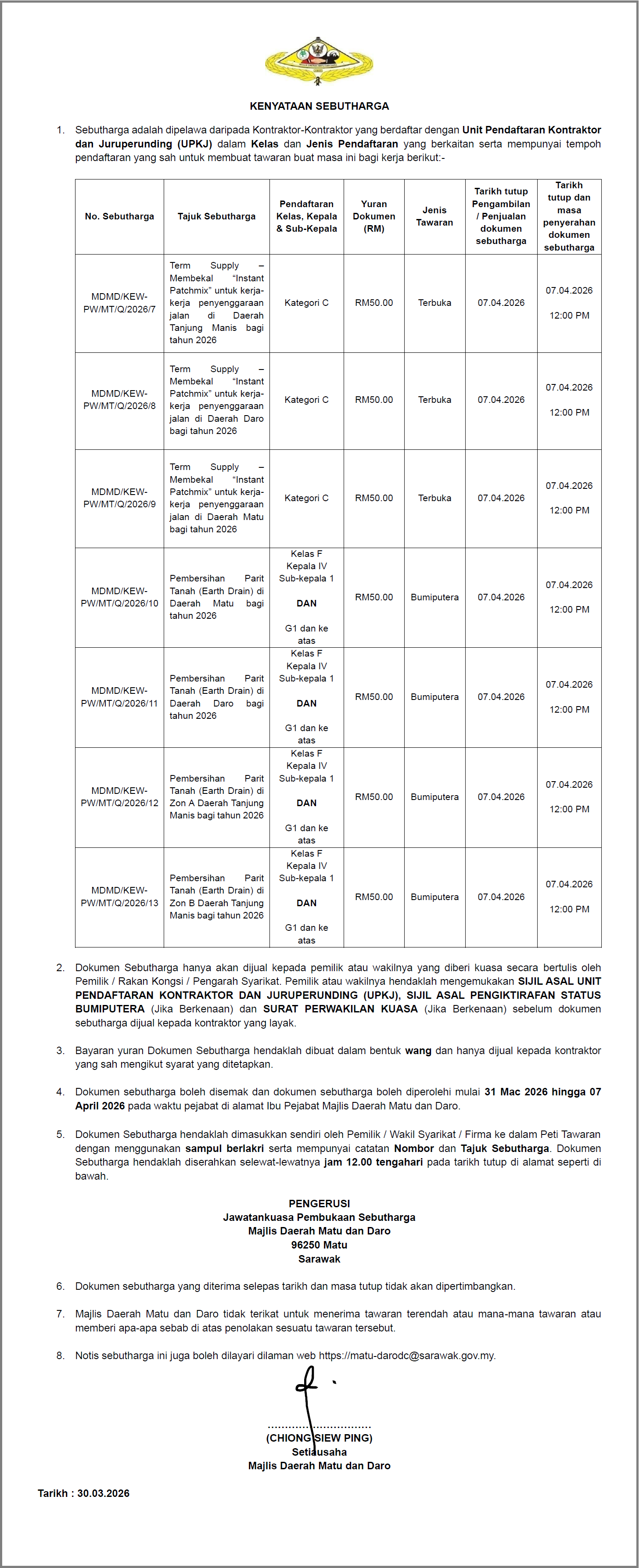 - Sebutharga adalah dipelawa daripada kontraktor-kontraktor yang berdaftar dengan Pejabat Daerah dan Majlis Daerah Matu Dan Daro yang berminat untuk menjalankan perkhidmatan seperti dalam jadual berikut.